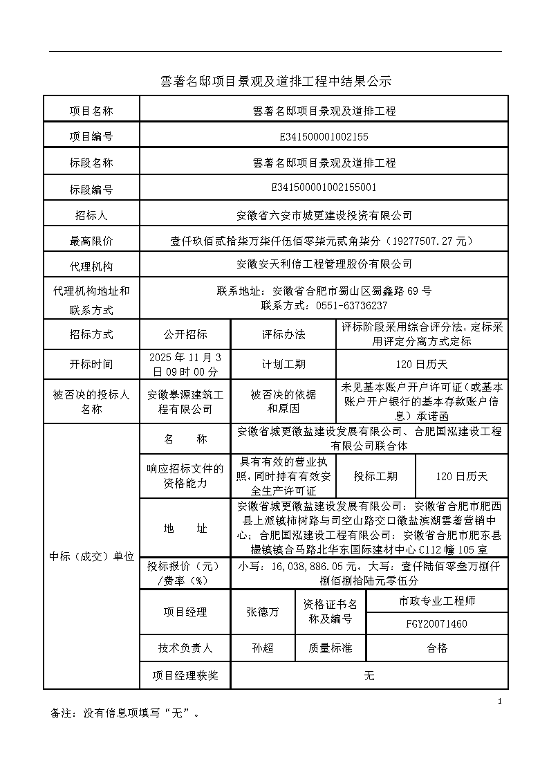雲(yún)著名邸項目景觀及道排工程中結(jié)果公示